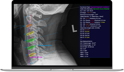 - 50+ AI-powered spinal measurements supporting cervical alignment, posture analysis, and segment-level evaluation.